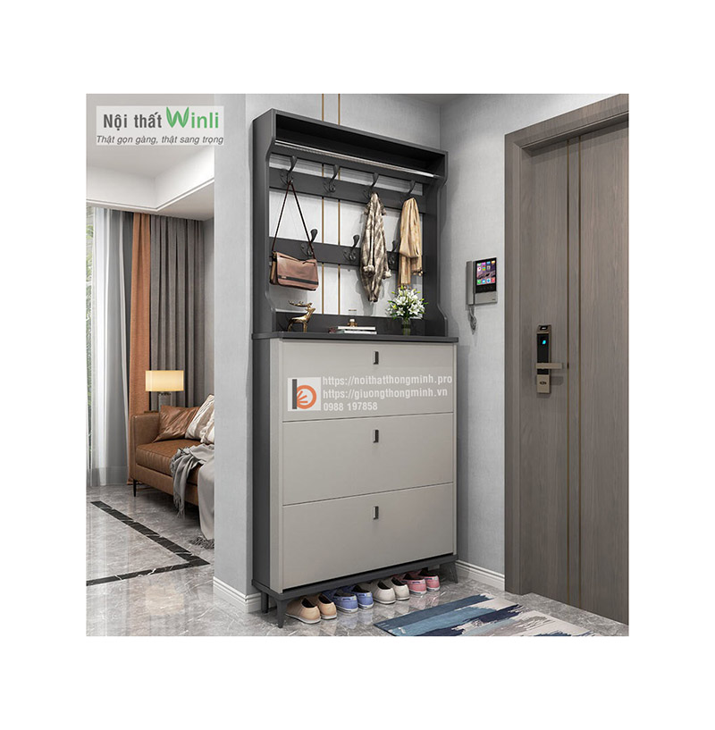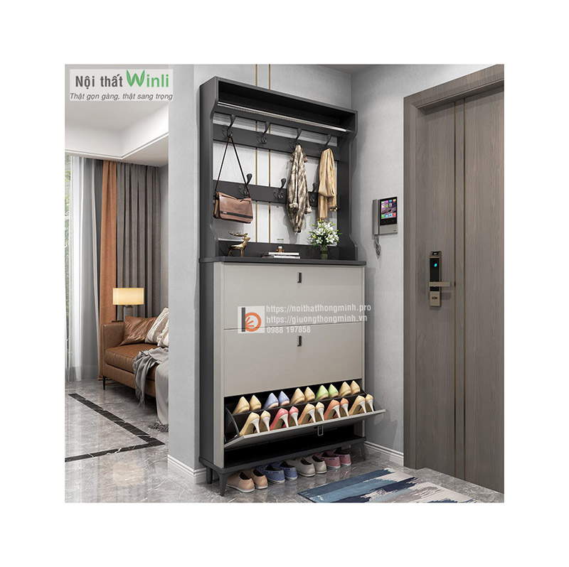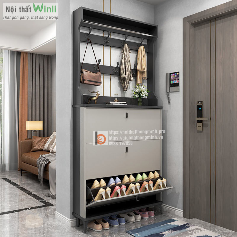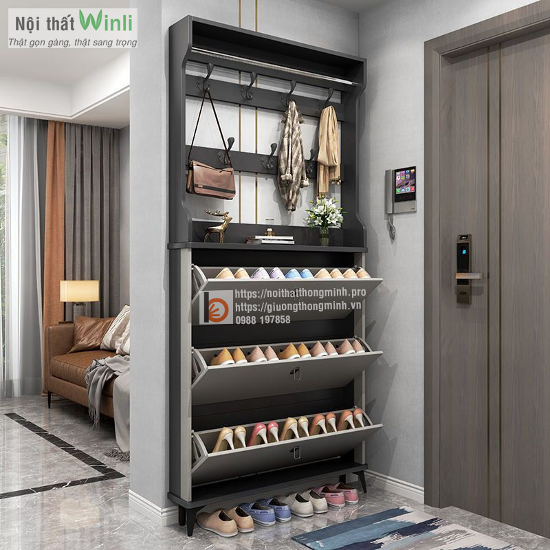 Nếu bạn cần một chiếc tủ để giày dép thông minh phù hợp với không gian cửa ra vào chật chội của ngôi nhà thì áp dụng ngay mẫu tủ giày thông minh 3 tầng siêu mỏng có móc treo đồ tiện lợi trên đây.